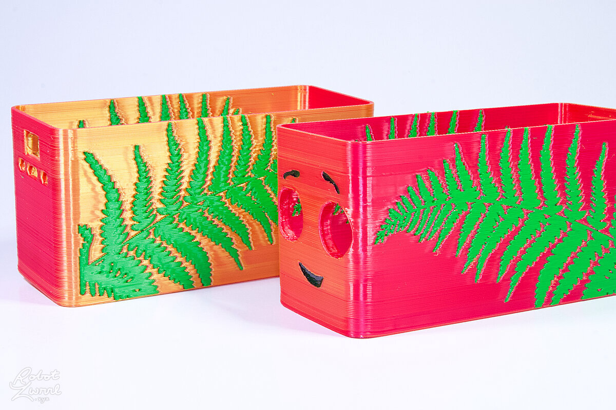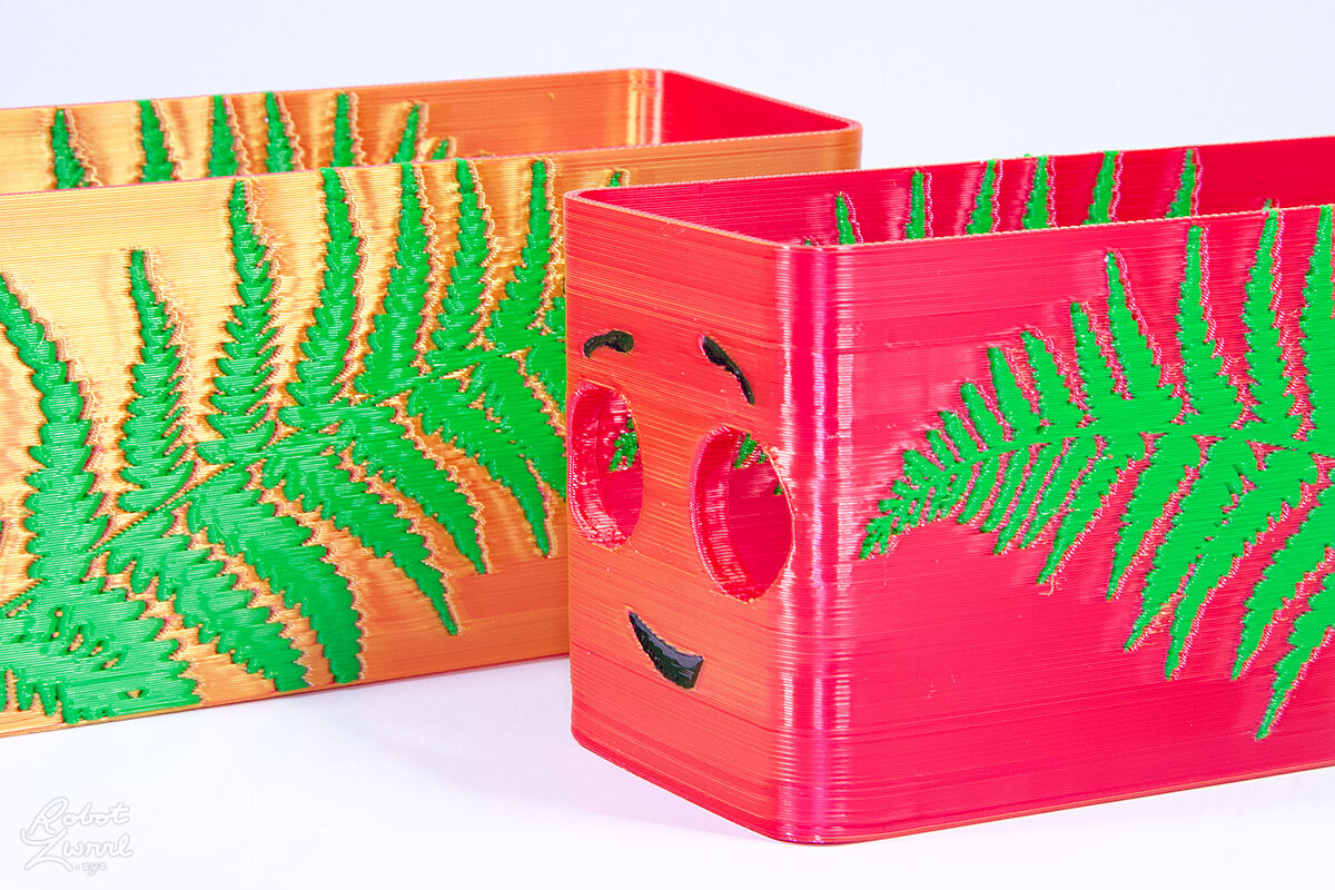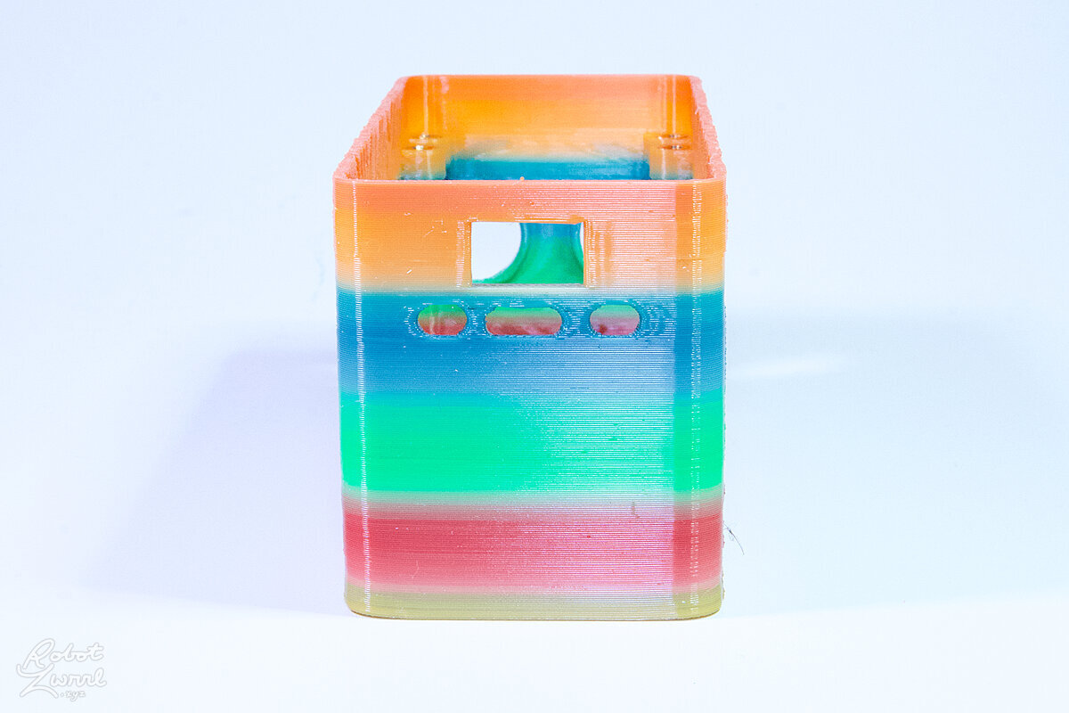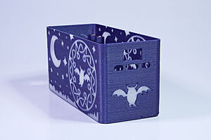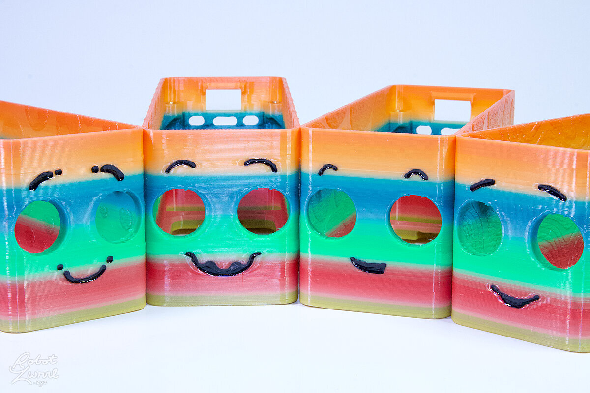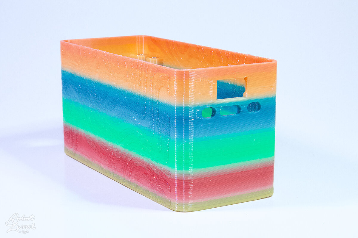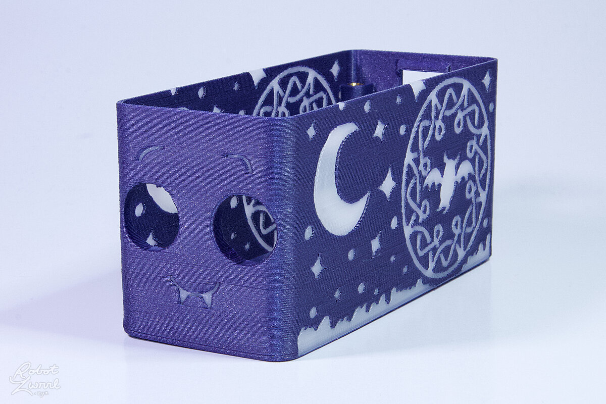 To celebrate the bat wing design, here's a special customized bat enclosure design! Printed in a purple filament with sparkles and glow in the dark. Over the winter holiday break a few other enclosure designs were printed. Including a duo-tone gold and magenta with a green fern splash on the side. As well as a set of four gradient colour change with patterned 'fuzzy skin' designs imprinted on the sides. Fun fact, the fuzzy skin enclosure with the voronoi pattern is the same that was used on Bowie the robot's base tiles! - 5 Jan 2026