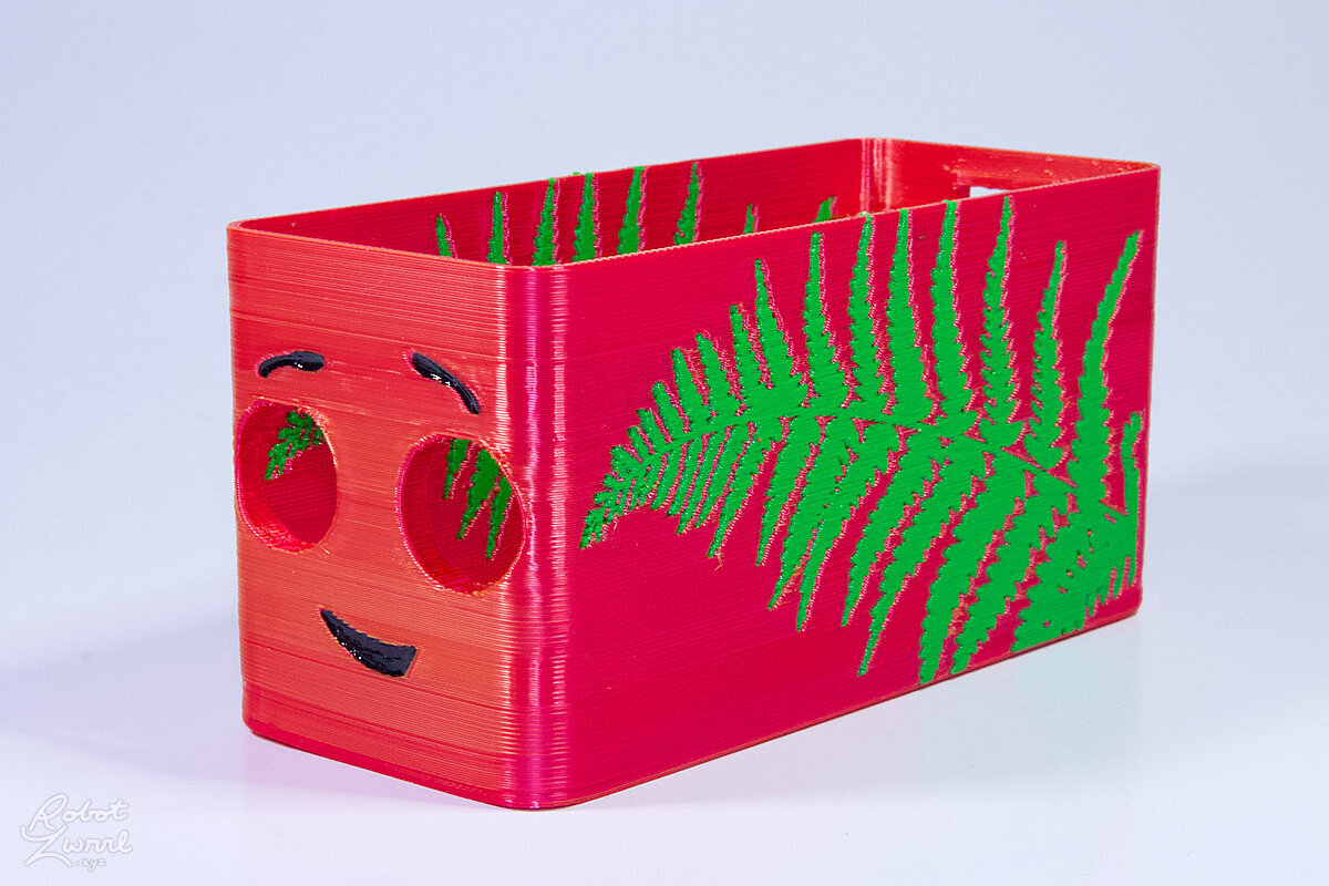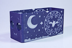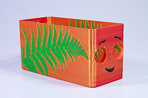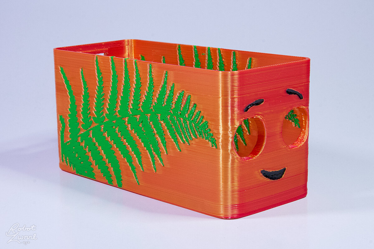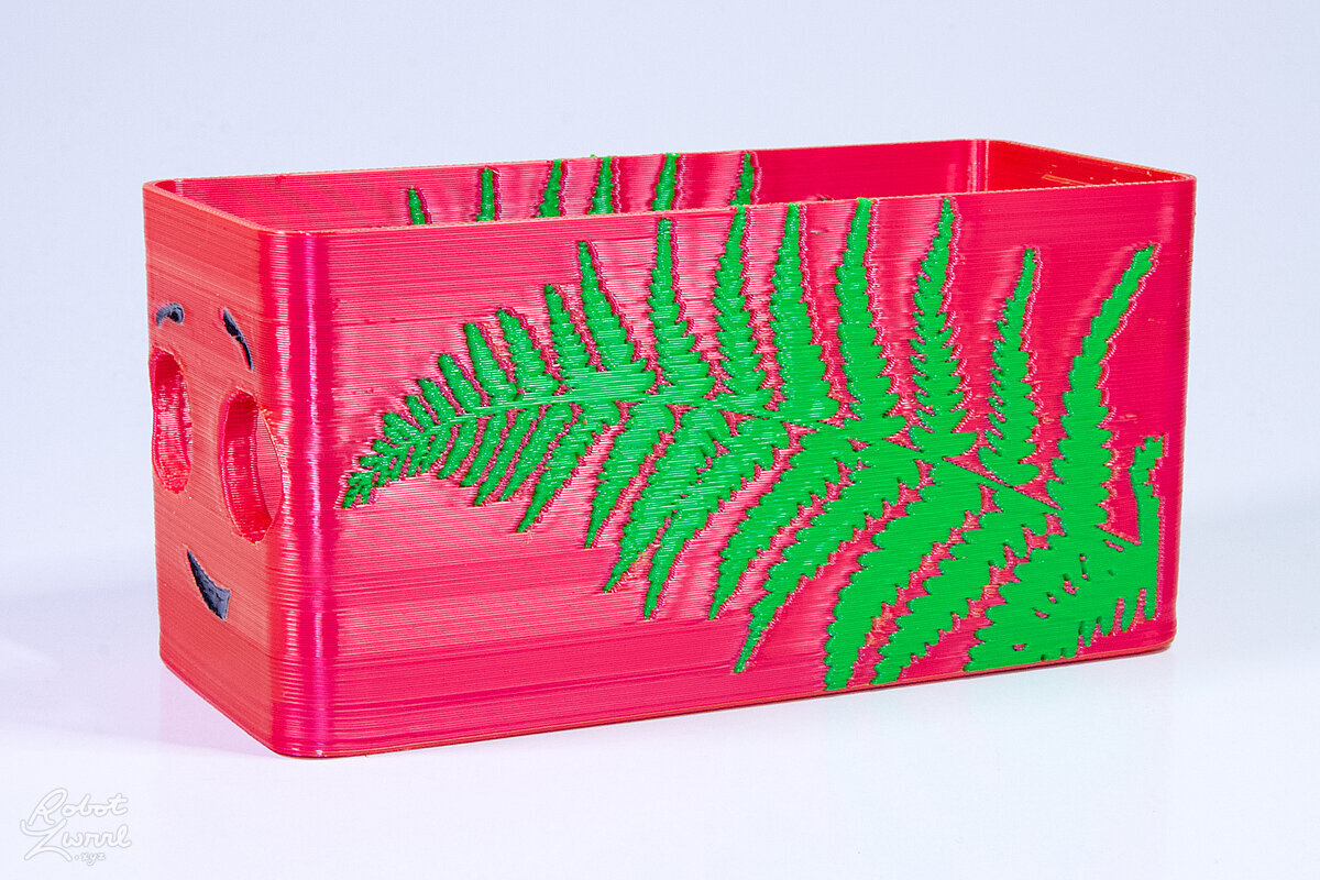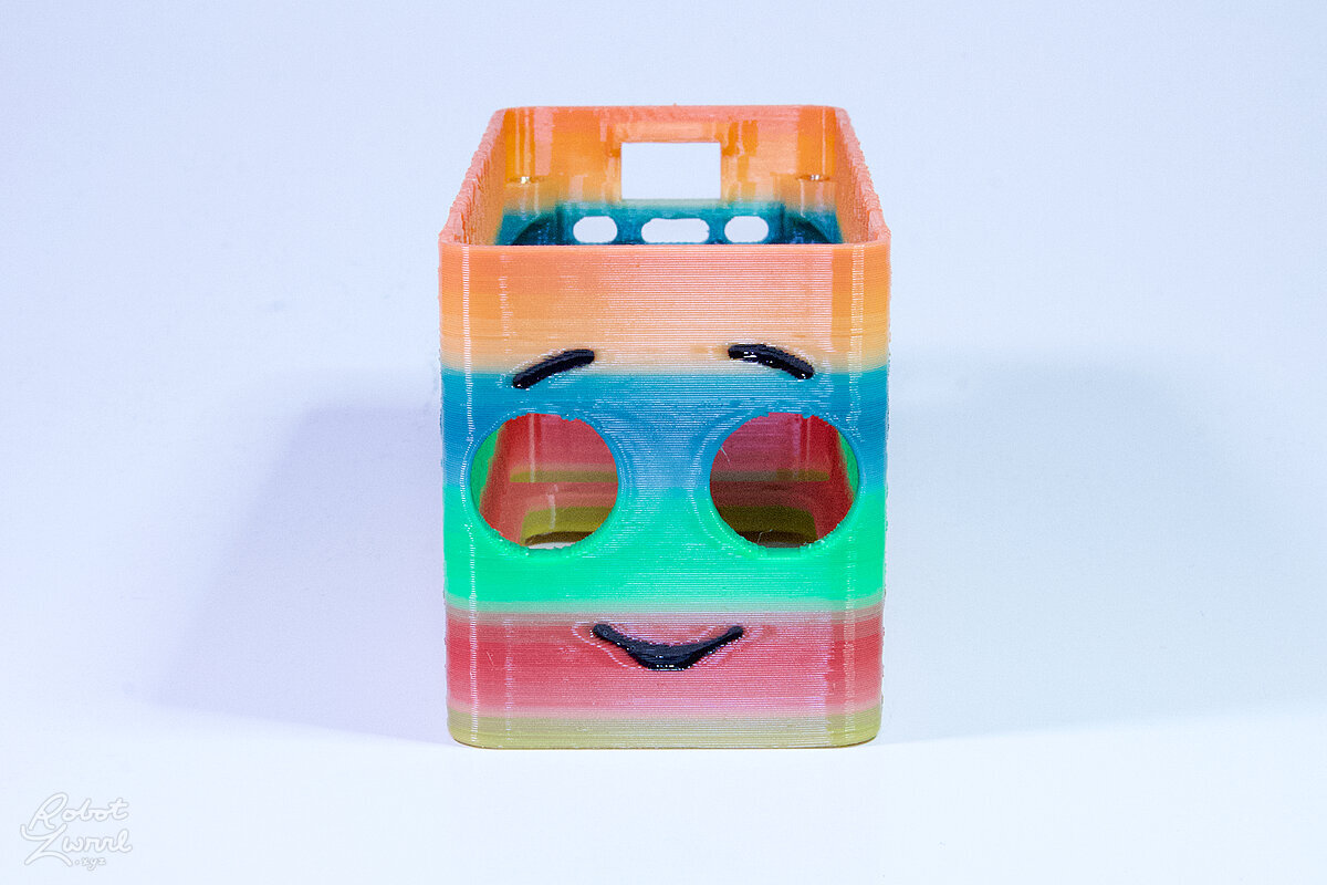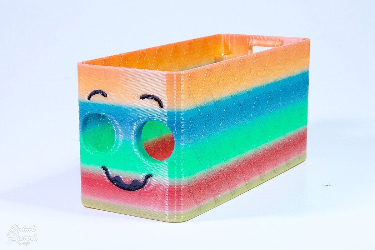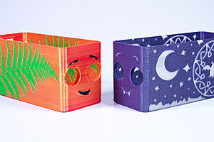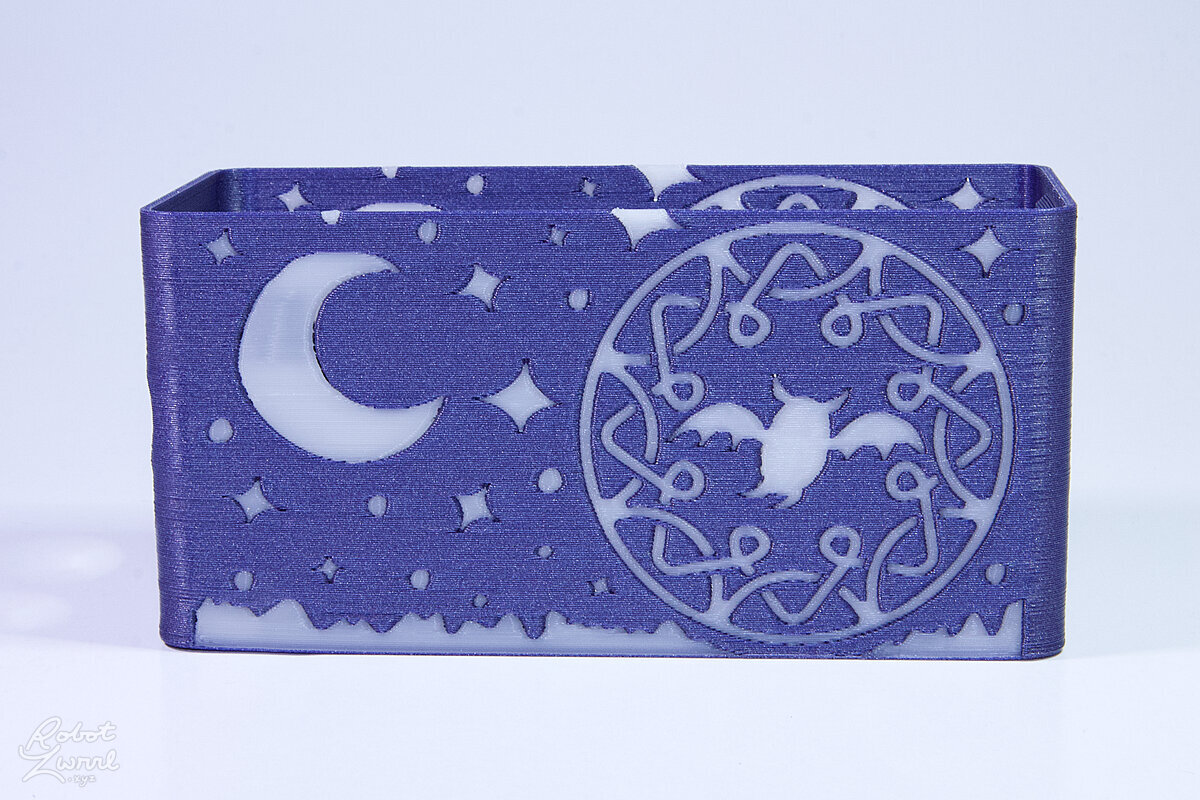 To celebrate the bat wing design, here's a special customized bat enclosure design! Printed in a purple filament with sparkles and glow in the dark. Over the winter holiday break a few other enclosure designs were printed. Including a duo-tone gold and magenta with a green fern splash on the side. As well as a set of four gradient colour change with patterned 'fuzzy skin' designs imprinted on the sides. Fun fact, the fuzzy skin enclosure with the voronoi pattern is the same that was used on Bowie the robot's base tiles! - 5 Jan 2026