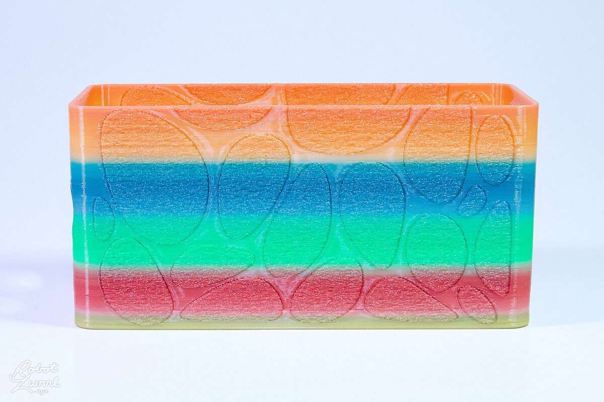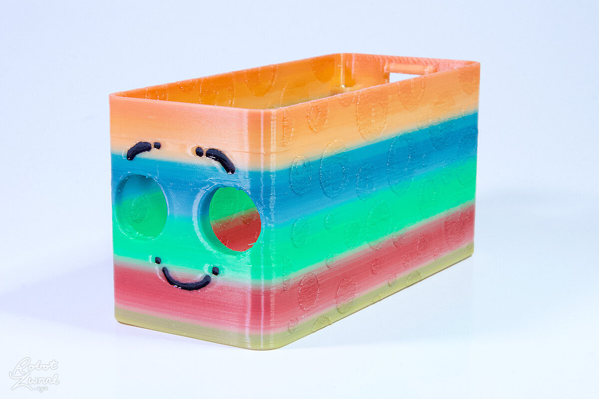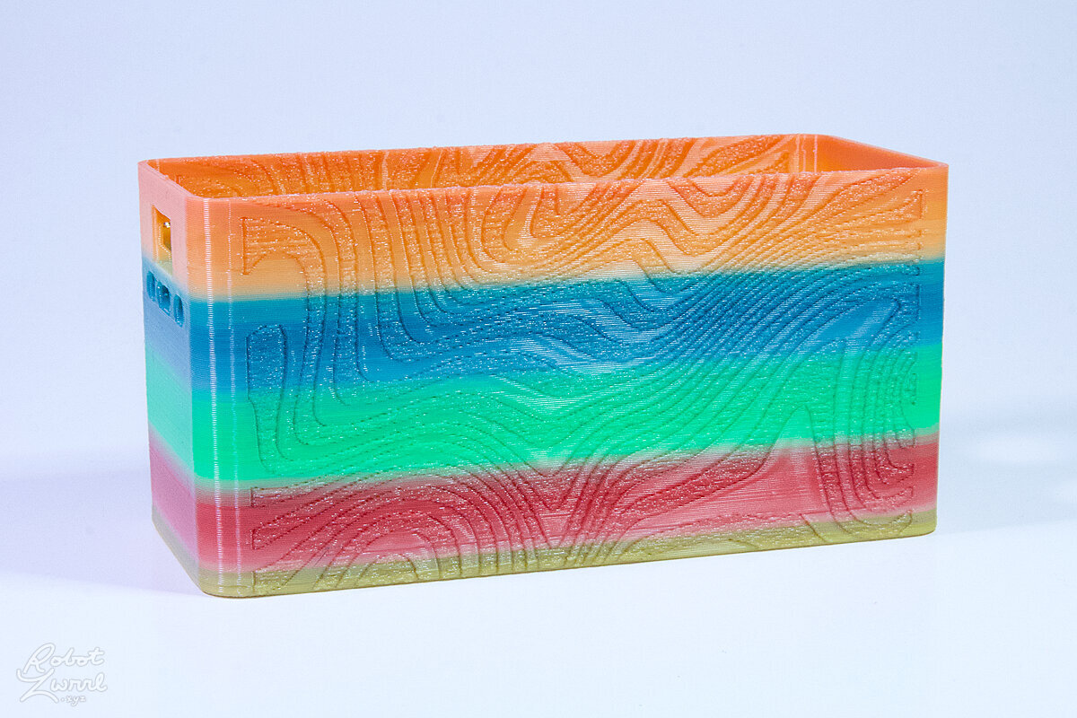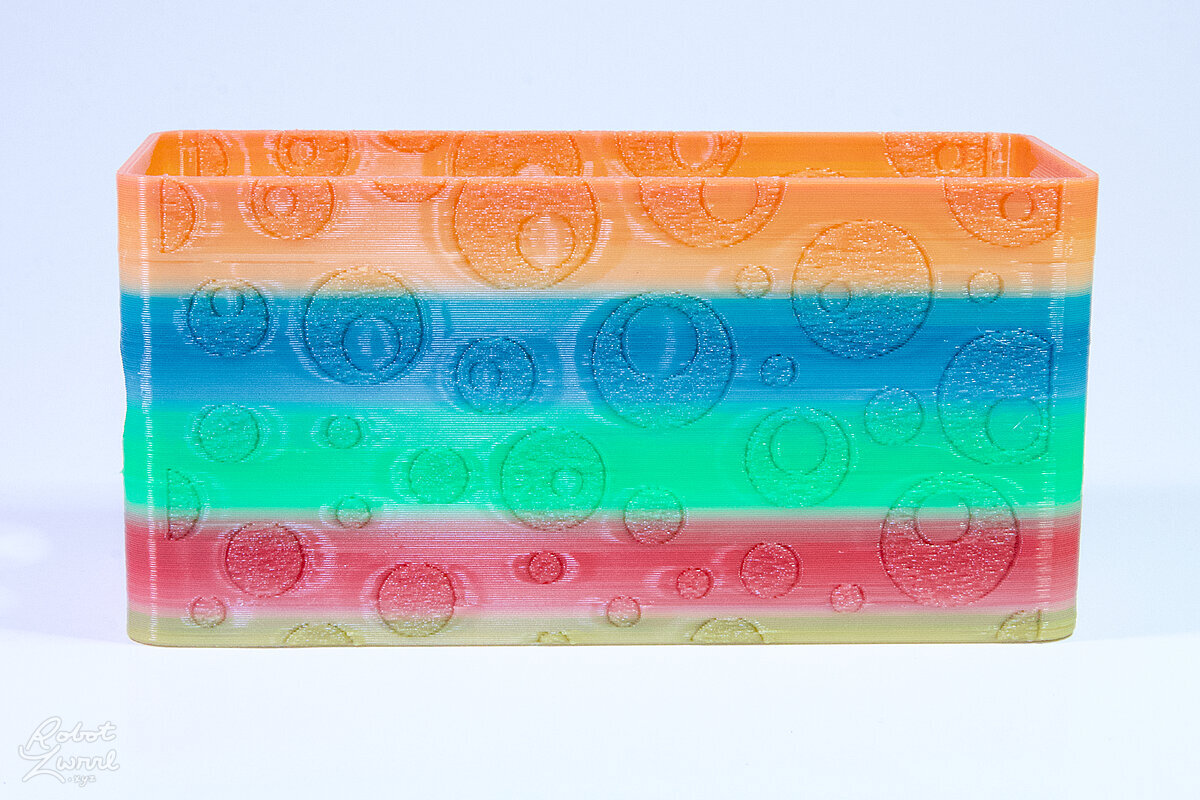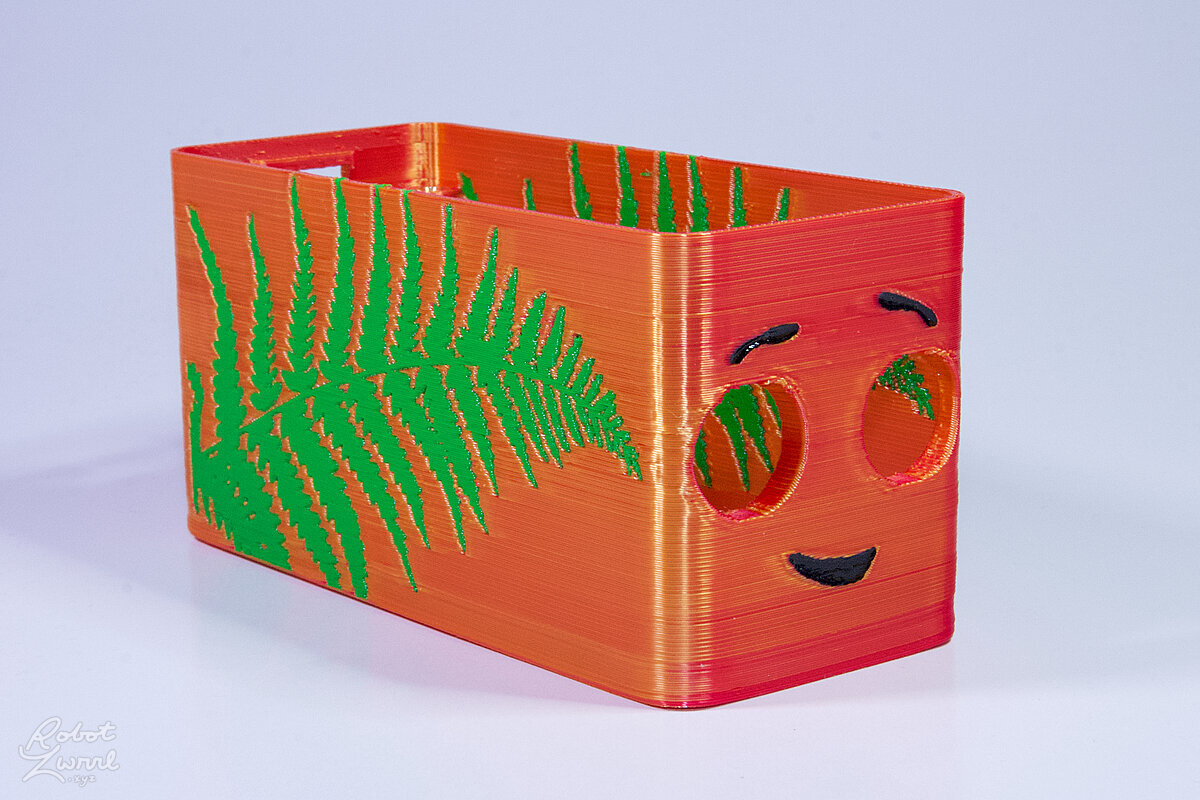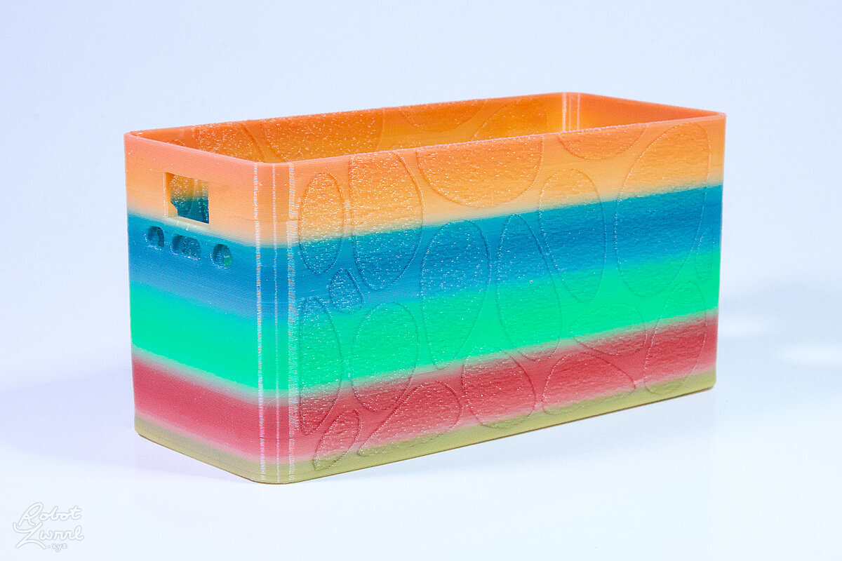 To celebrate the bat wing design, here's a special customized bat enclosure design! Printed in a purple filament with sparkles and glow in the dark. Over the winter holiday break a few other enclosure designs were printed. Including a duo-tone gold and magenta with a green fern splash on the side. As well as a set of four gradient colour change with patterned 'fuzzy skin' designs imprinted on the sides. Fun fact, the fuzzy skin enclosure with the voronoi pattern is the same that was used on Bowie the robot's base tiles! - 5 Jan 2026