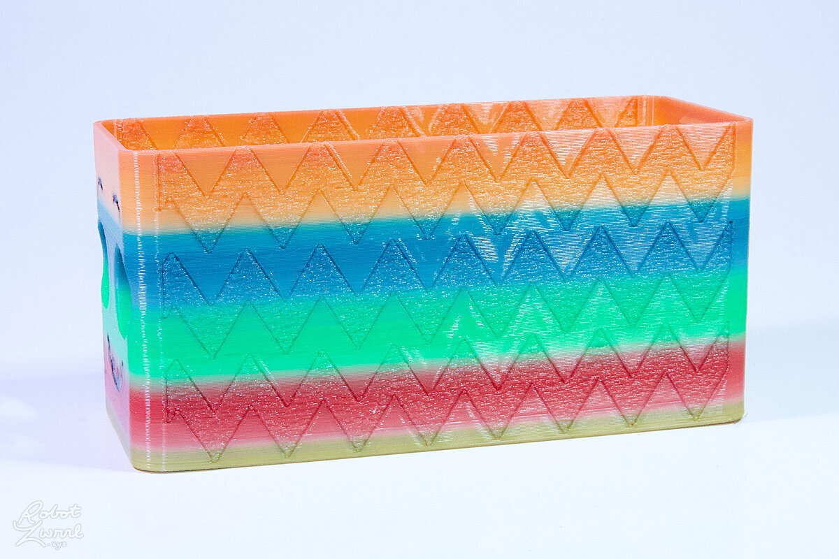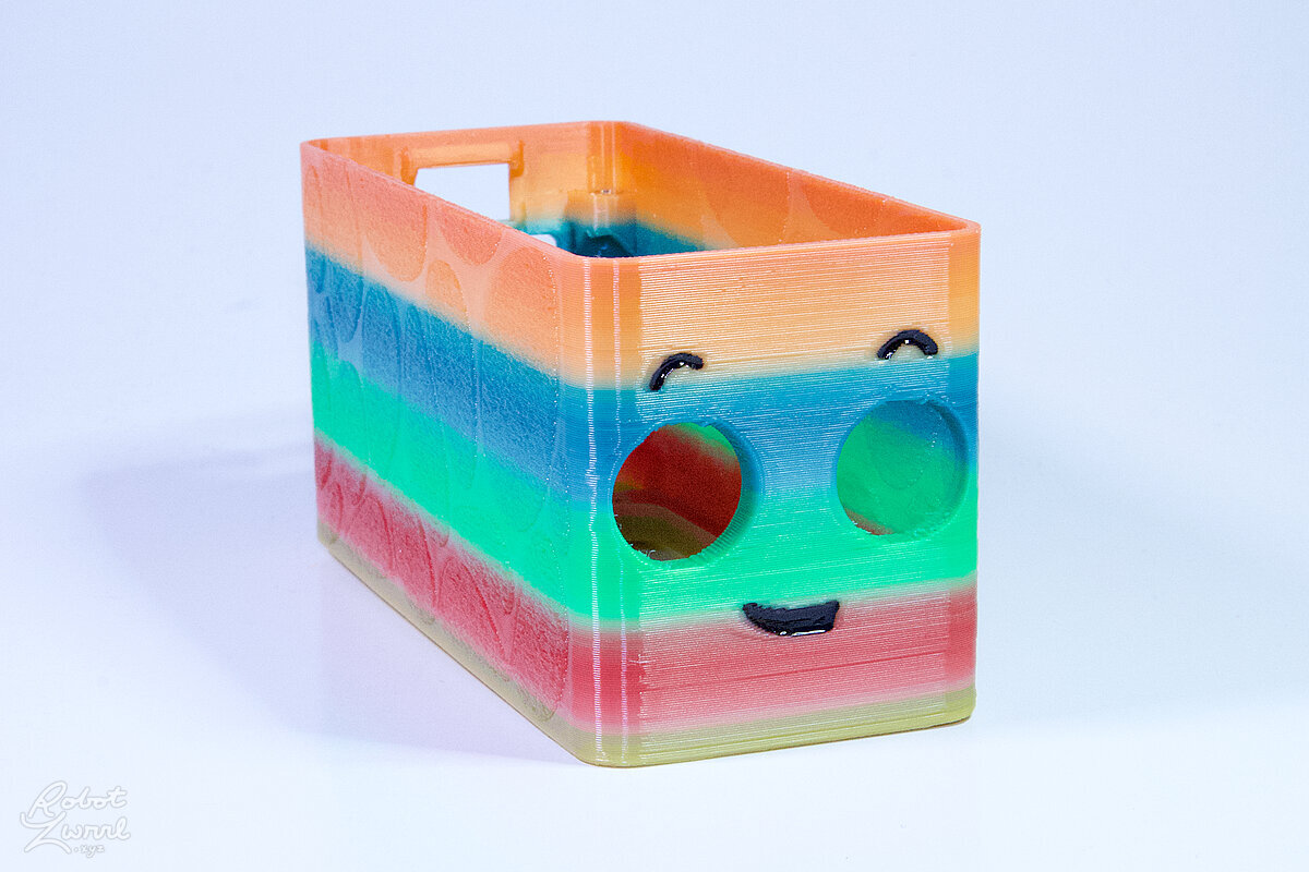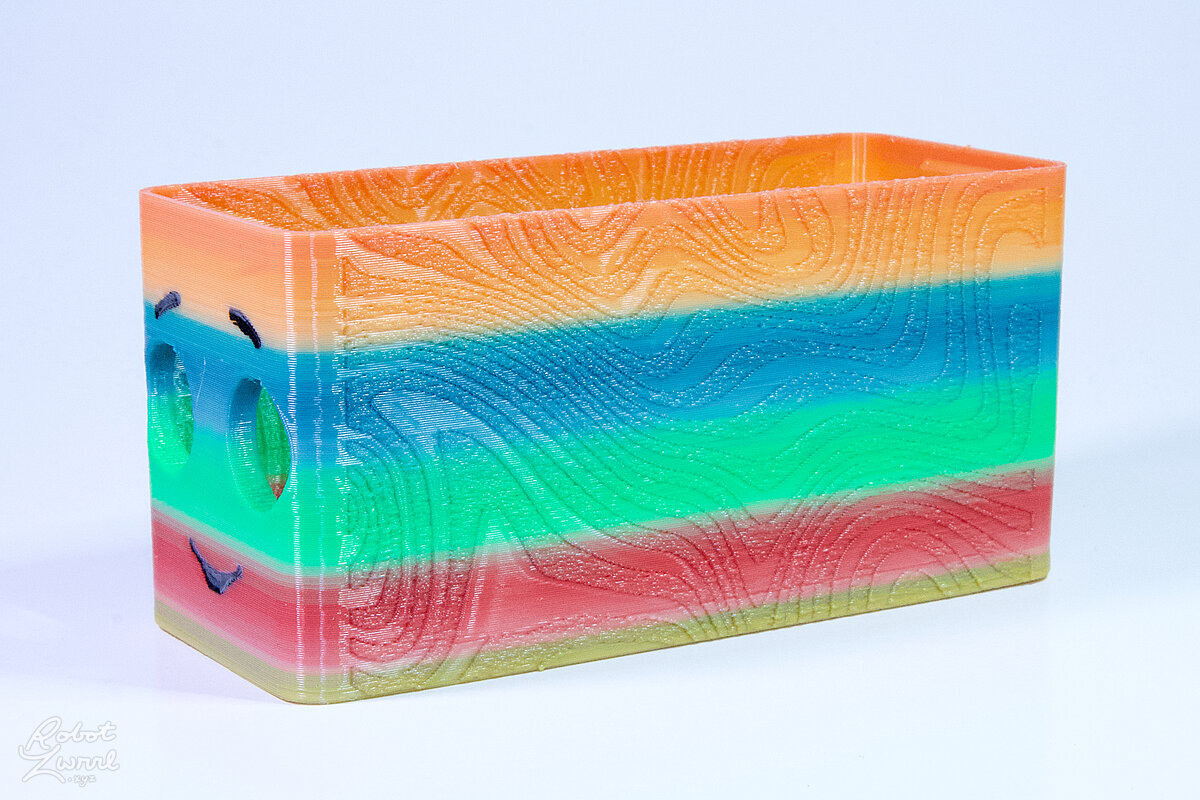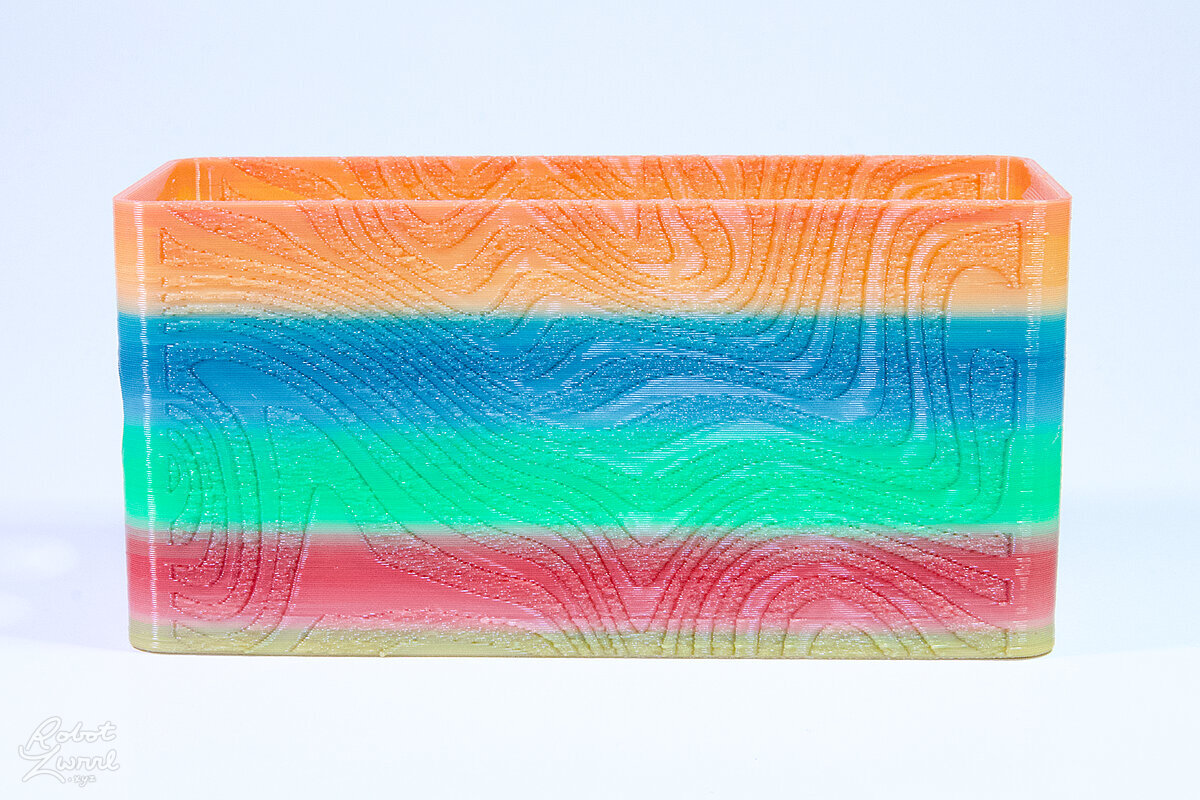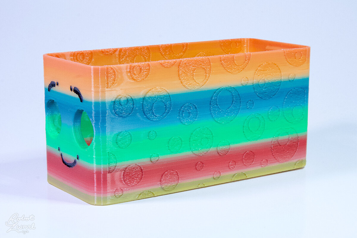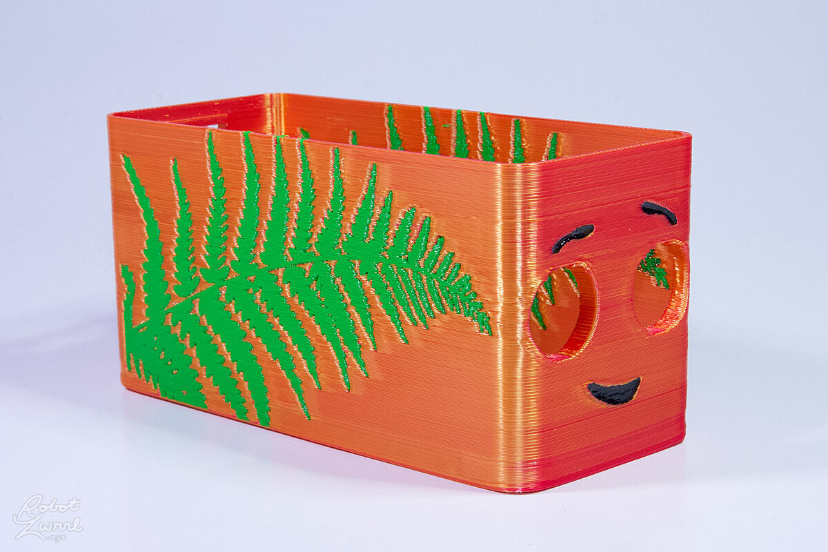 To celebrate the bat wing design, here's a special customized bat enclosure design! Printed in a purple filament with sparkles and glow in the dark. Over the winter holiday break a few other enclosure designs were printed. Including a duo-tone gold and magenta with a green fern splash on the side. As well as a set of four gradient colour change with patterned 'fuzzy skin' designs imprinted on the sides. Fun fact, the fuzzy skin enclosure with the voronoi pattern is the same that was used on Bowie the robot's base tiles! - 5 Jan 2026