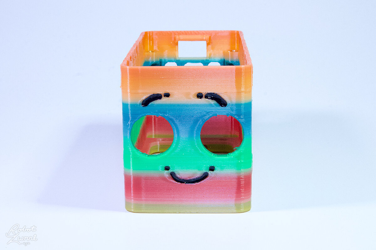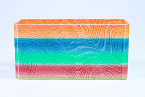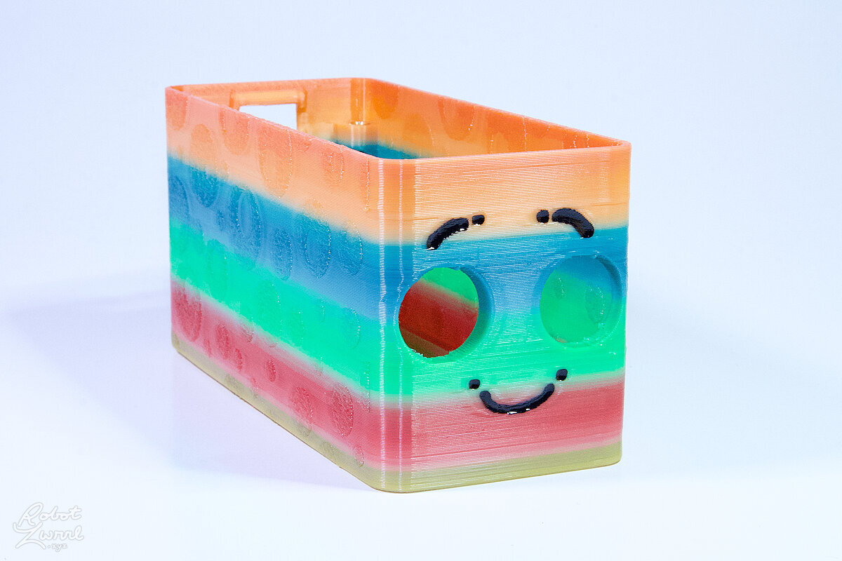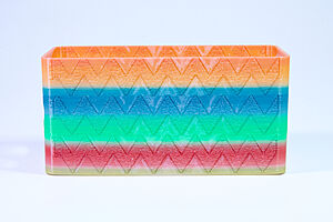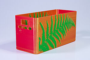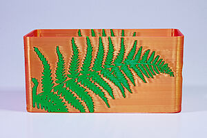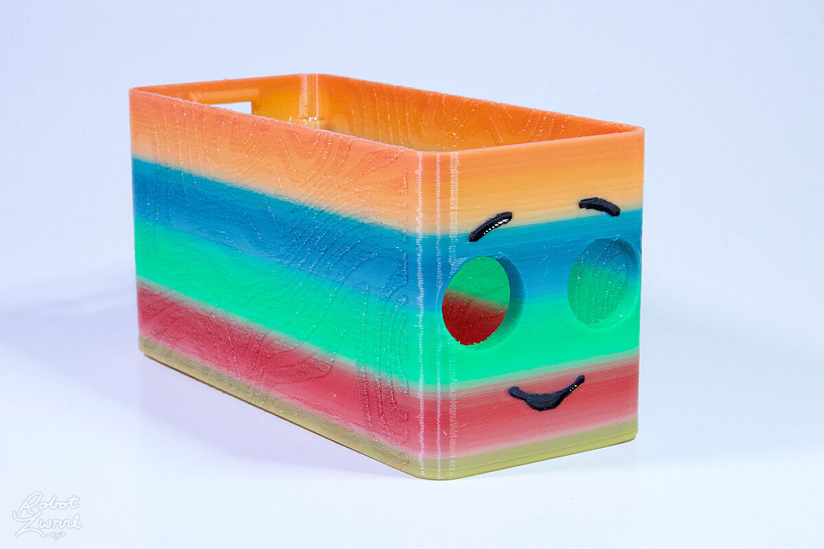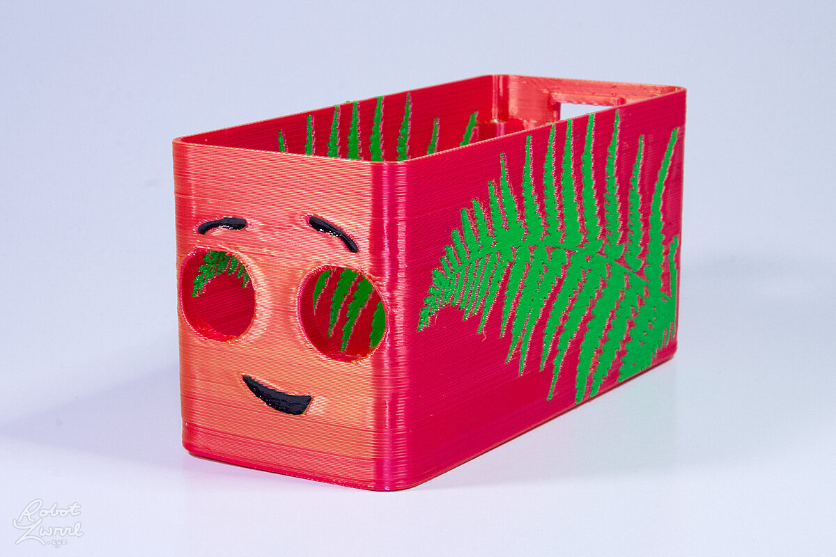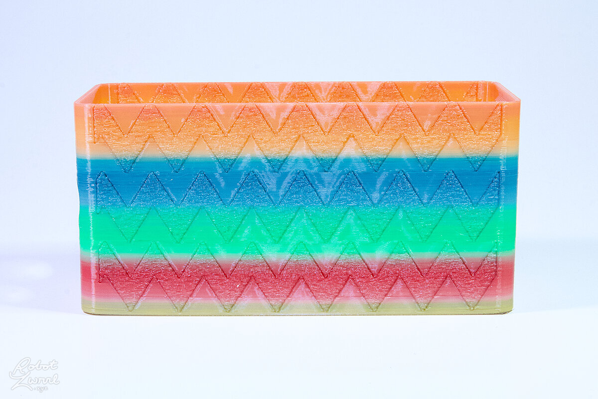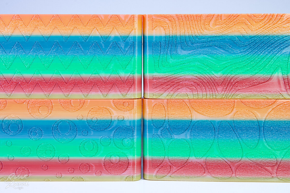 To celebrate the bat wing design, here's a special customized bat enclosure design! Printed in a purple filament with sparkles and glow in the dark. Over the winter holiday break a few other enclosure designs were printed. Including a duo-tone gold and magenta with a green fern splash on the side. As well as a set of four gradient colour change with patterned 'fuzzy skin' designs imprinted on the sides. Fun fact, the fuzzy skin enclosure with the voronoi pattern is the same that was used on Bowie the robot's base tiles! - 5 Jan 2026